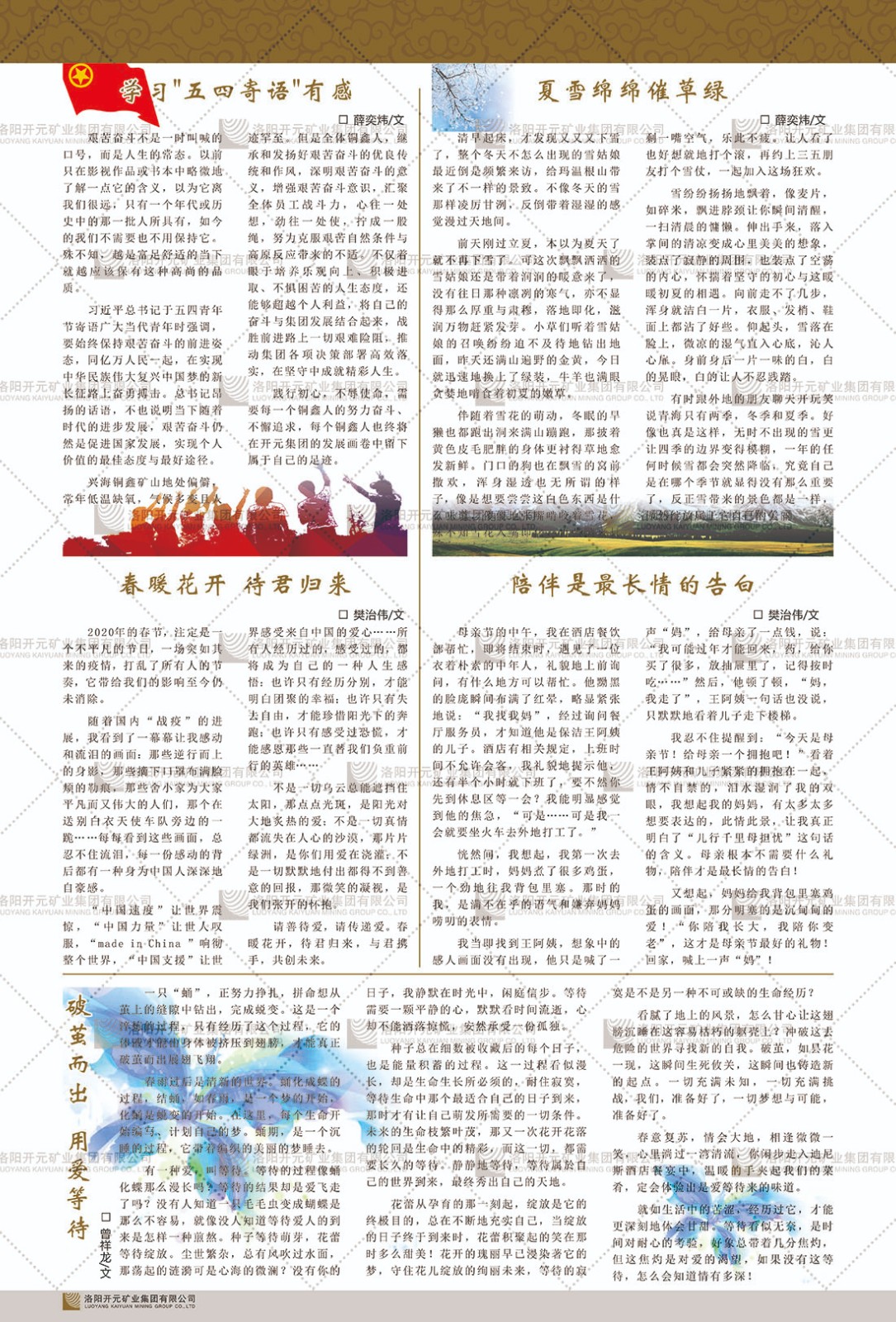 洛陽(yáng)開(kāi)元礦業(yè)集團(tuán)有限公司簡(jiǎn)介洛陽(yáng)開(kāi)元礦業(yè)集團(tuán)有限公司,始成立于2006年,位于洛陽(yáng)市開(kāi)元大道269號(hào)。集團(tuán)旗下共有五余家全資子公司,業(yè)務(wù)涉及有色金屬礦山開(kāi)發(fā)、礦產(chǎn)品購(gòu)銷(xiāo)與進(jìn)出口貿(mào)易、房地產(chǎn)開(kāi)發(fā)、文化藝術(shù)、企業(yè)管理與咨詢、資本投資等多個(gè)領(lǐng)域。民建河南省委委員、民建河南省委企業(yè)委副主任、民建洛陽(yáng)市委委員、企業(yè)委主任、洛陽(yáng)民建企業(yè)家協(xié)會(huì)會(huì)長(zhǎng)許明月是公司創(chuàng)始人,現(xiàn)任洛陽(yáng)開(kāi)元礦業(yè)集團(tuán)有限公司董事長(zhǎng)。在礦業(yè)領(lǐng)域,洛陽(yáng)開(kāi)元礦業(yè)集團(tuán)擁有多家實(shí)力雄厚的子公司:貴州開(kāi)元礦業(yè)有限公司探、采礦權(quán)面積共11.33平方公里;興海縣銅鑫礦業(yè)有限公司探礦權(quán)面積8.76平方公里,礦山資源潛力巨大;2021年,開(kāi)元集團(tuán)與盧氏中科礦業(yè)有限公司開(kāi)展戰(zhàn)略合作。盧氏中科礦業(yè)有限公司專注于有色金屬的浮選、加工和銷(xiāo)售,擁有強(qiáng)大的技術(shù)支撐平臺(tái),是集探、采、選、冶、研為一體的中大型綜合礦業(yè)企業(yè)。目前,盧氏中科王家河1000噸選礦廠已成功投產(chǎn),雙河金礦、柳關(guān)欒盧鉛鋅礦相繼順利開(kāi)工,樓房銀礦與圪老灣鉛鋅礦的深部探礦重大突破,標(biāo)志著礦山版圖取得重大進(jìn)展,為開(kāi)元集團(tuán)后續(xù)發(fā)展奠定了堅(jiān)實(shí)基礎(chǔ)。在文化傳媒領(lǐng)域,洛陽(yáng)市明月美術(shù)館通過(guò)豐富多樣的藝術(shù)展覽、學(xué)術(shù)研討和公共教育活動(dòng),努力打造一個(gè)集展覽、交流、教育、研究為一體的綜合性藝術(shù)平臺(tái)。此外,在金融投資領(lǐng)域,開(kāi)元集團(tuán)旗下的北京明峰資本管理有限公司專注于投資具有高增長(zhǎng)潛力的優(yōu)秀企業(yè),特別是高科技、新能源、環(huán)保等新興產(chǎn)業(yè),為客戶提供個(gè)性化的資產(chǎn)配置服務(wù)。在做好企業(yè)經(jīng)營(yíng)的同時(shí),開(kāi)元集團(tuán)始終不忘企業(yè)的社會(huì)責(zé)任和家國(guó)情懷,以突出的愛(ài)心公益事跡,開(kāi)展了一系列公益慈善活動(dòng):“民建林”公益事業(yè)通過(guò)“思源基金”“幫幫公益”線上公益平臺(tái),與眾多愛(ài)心人士籌措資金20余萬(wàn)元;資助541名貧困大學(xué)生共計(jì)270余萬(wàn)元,推進(jìn)“數(shù)字助力——河南AI人才培養(yǎng)”;捐款10萬(wàn)元,馳援京津冀、黑龍江洪水地質(zhì)災(zāi)害……公司于2017年底被洛陽(yáng)市慈善總會(huì)評(píng)為“洛陽(yáng)慈善風(fēng)云榜——十大愛(ài)心集體”。洛陽(yáng)開(kāi)元礦業(yè)集團(tuán)有限公司秉承持續(xù)發(fā)展理念,憑借多年來(lái)良好的企業(yè)信譽(yù)與經(jīng)營(yíng)業(yè)績(jī),與全國(guó)多家企業(yè)建立了良好合作關(guān)系,受到社會(huì)各界的一致好評(píng),多次榮獲“納稅標(biāo)兵”“先進(jìn)企業(yè)”“招商引資模范企業(yè)”等榮譽(yù)稱號(hào)。回望來(lái)時(shí)路,開(kāi)元人勠力同心,以“闖”的精神和“創(chuàng)”的勁頭,一路披荊斬棘,踏過(guò)千山萬(wàn)水;展望新未來(lái),開(kāi)元人凝心聚力,不執(zhí)于“舊”,無(wú)畏于“新”,秉承“勇于跨越,追求卓越”的企業(yè)精神,乘著國(guó)家高質(zhì)量發(fā)展新征程的東風(fēng),跨過(guò)高山,越過(guò)大海,向著集團(tuán)多元化、國(guó)際化的目標(biāo),逐夢(mèng)遠(yuǎn)航,跨越前行!